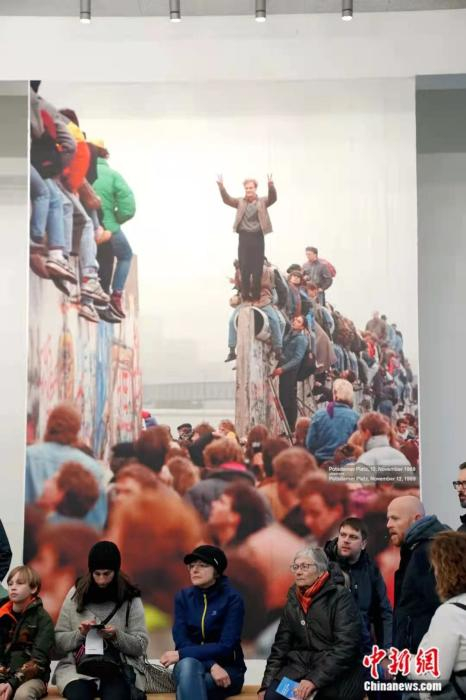 2019年11月,游客在德国柏林墙遗址纪念公园展出的一幅反映人们欢呼柏林墙倒塌的著名照片前参观。柏林墙修建于1961年,1989年被拆除。在其存在的28年间,柏林墙被视作两德分裂和冷战东西方阵营对峙的象征。中新社记者 彭大伟 摄