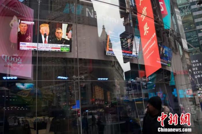 2020年1月,纽约时代广场的电视直播特朗普电视讲话吸引路人驻足观看。中新社记者 廖攀 摄