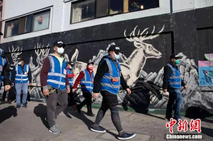 2021年3月,一支由美国加州奥克兰唐人街商户和居民自发组成的义工安全巡逻队在唐人街巡逻。新冠疫情暴发以来,美国一些城市连续发生针对亚裔的歧视和暴力犯罪事件。中新社记者 刘关关 摄