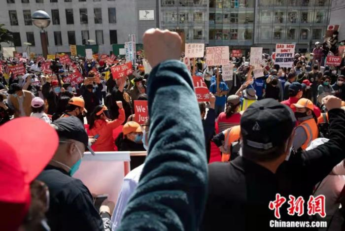 2021年3月,美国加州旧金山大批民众走上街头,抗议针对亚裔的歧视和暴力行为。当日,美国多地爆发反对歧视亚裔的游行和集会。中新社记者 刘关关 摄