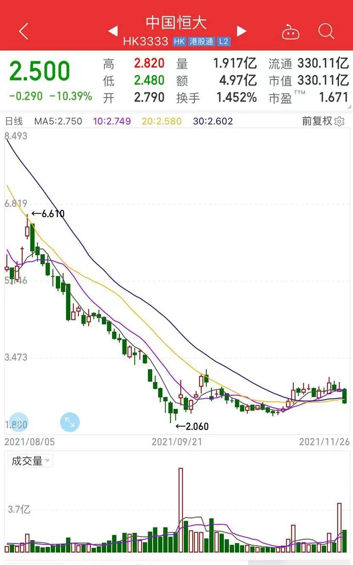 截至11月26日收盘,中国恒大报收2.5港元,跌10.39%,成交量1.917亿股,成交额4.97亿港元,总市值331亿港元。