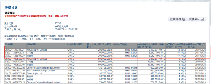 11月26日,据港交所文件披露:11月25日,许家印、Xin Xin (BVI) Limited、丁玉梅合计卖出12亿股中国恒大(03333.HK)股份,每股平均价格为2.23港元,卖出金额合计约26.76亿港元。