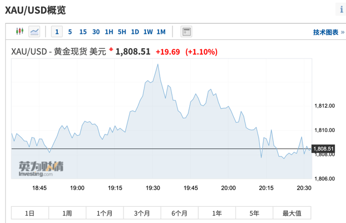 日元、黄金等避险资产反弹,日元兑美元上涨约0.94%至114.25,黄金大涨1.1%至每盎司1808.51美元。
