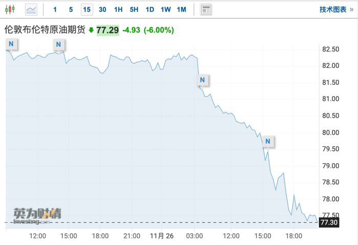 国际油价今天也遭遇重挫,明年1月交货的纽商所轻质原油期货价格跌幅扩大至6.34%,报73.53美元/桶。布伦特原油期货现跌6%。