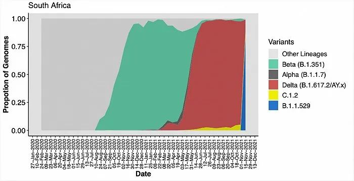 此外,在目前的初步数据中,新变种已经有在南非迅速传播的迹象。南非官员奥利维拉在推特上发布了一张该国流行新冠毒株测序的。该图表显示,在短短两周的时间里,B.1.1.529变种已经取代了德尔塔毒株,成为南非新增确诊病例中主要流行的变种,占新增总数的75%以上。