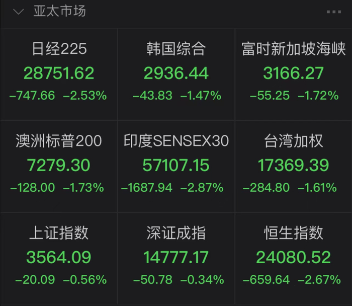 11月26日周五,亚太股市集体下跌。日本股市大跌,日经255指数重挫2.53%,东京证券交易所股票价格指数下跌2.01%。印度、印尼股市均跌超2%,澳大利亚股市大跌1.73%,韩国股市综合股价指数收盘下跌1.47%。富时新加坡海峡指数跌近2%。港股低开低走,跌幅持续扩大。恒指大跌2.67%,创逾一个半月低位,恒生科技指数跌3.25%,恒生中国企业指数跌幅达2.65%。快手跌逾8%,阿里巴巴跌逾4%。