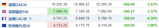 下午欧股开盘后跌幅快速扩大,截止发稿,欧元区斯托克50指数期货跌近4%,英国富时100指数期货下跌3.37%,德国DAX指数跌3.43%。法国CAC40指数日内跌幅扩大至4%,创去年10月来最大跌幅。南非主要股指下跌2.1%,创两个月最大跌幅。