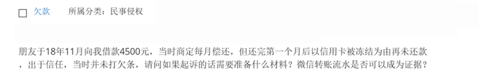 朋友于2018年11月向我借了4500元,当时我们商定每月偿还给我多少,但还完第一个月后,对方以信用卡被冻结为由再未还款,出于信任,当时我们并未打欠条,请问如果起诉的话需要准备什么材料?此外,微信转账记录是否可以算作证据?