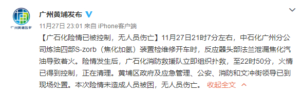 11月27日21时7分左右,中石化广州分公司炼油四部S-zorb(焦化加氢)装置检维修开车时,反应器头部法兰泄漏焦化汽油导致着火。险情发生后,广石化消防救援队立即组织扑救,至22时50分,火情已得到控制,正在清理。黄埔区政府及应急管理、公安、消防和文冲街领导已到现场处置。本次险情未造成人员被困,无人员伤亡。