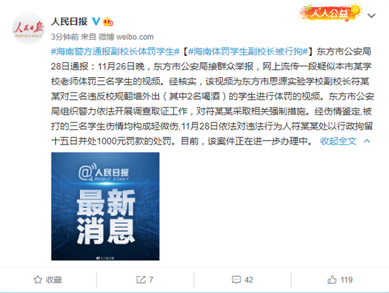 据人民日报消息,东方市公安局28日通报:11月26日晚,东方市公安局接群众举报,网上流传一段疑似本市某学校老师体罚三名学生的视频。经核实,该视频为东方市思源实验学校副校长符某某对三名违反校规翻墙外出(其中2名喝酒)的学生进行体罚的视频。东方市公安局组织警力依法开展调查取证工作,对符某某采取相关强制措施。经伤情鉴定,被打的三名学生伤情均构成轻微伤,11月28日依法对违法行为人符某某处以行政拘留十五日并处1000元罚款的处罚。目前,该案件正在进一步办理中。