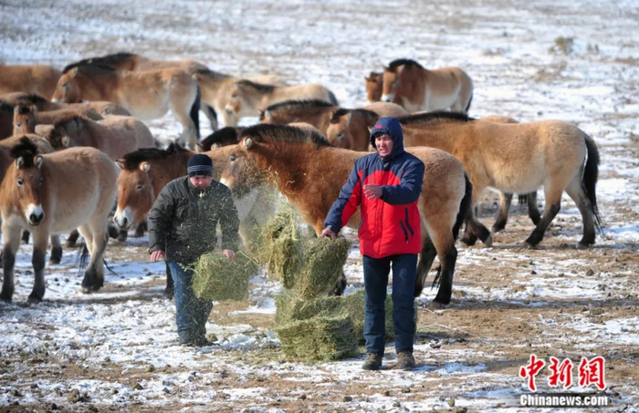 2012年3月初,在新疆卡拉麦里山自然保护区一普氏野马野放点,工作人员正在为野放的普氏野马投放草料。中新社记者 刘新 摄