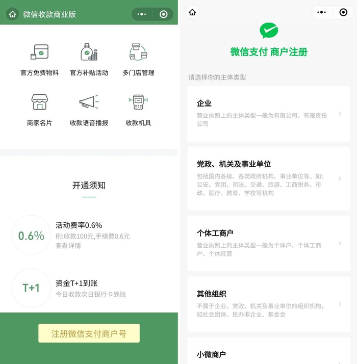 就目前操作流程而言,记者通过手机扫码进入自助申请页面,页面显示“活动费率0.6%”“资金T+1到账”等开通须知提示。进入商户注册界面,可以发现微信收款码商业版一共向5种主体类型开放注册,分别是企业,党政、机关及事业单位,个体工商户,其他组织(如社会团体、民办非企业、基金会)和小微商户,各主体类型在申请时需要准备的材料也存在区别。