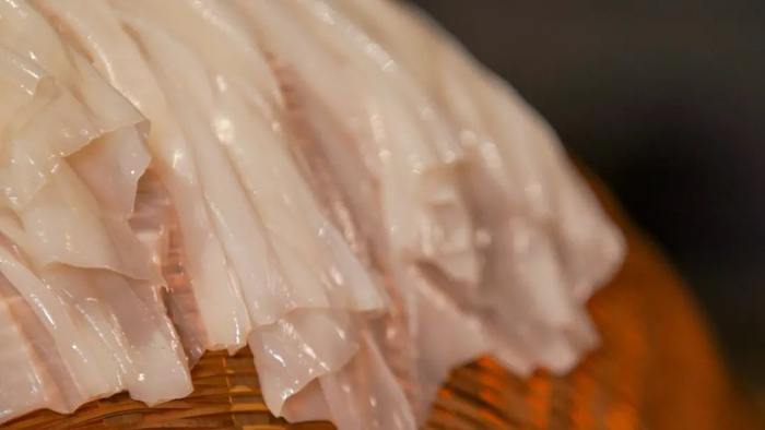 这样制作出来的粉,厚度很薄,只有0.5-0.7毫米;薄可透明、通透洁净、爽滑可口,像缎子一样亮丽、纯白,没有任何化学成分,只有天然纯正的米香味。