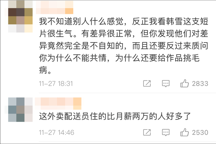 联系到本次外卖员入驻月租近万的短片,有网友表示,现在的文艺工作者太脱离实际,没有描述生活的能力,真想要拍大众喜欢的电影,还是应该亲自去感受。
