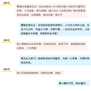 随后,易中天在文中晒出了与批评者李蓬勃的对话短信内容。