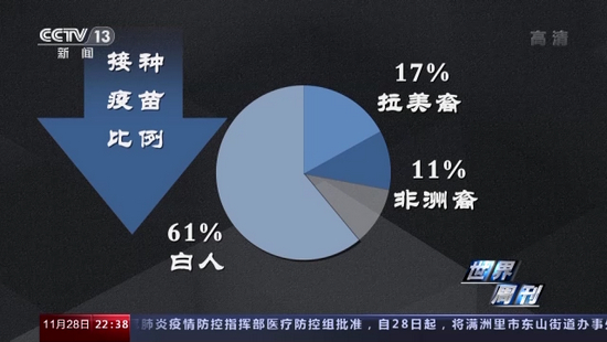 美国疾控中心11月16日公布的数据显示,在至少接种过一剂新冠疫苗的美国人中,63%有可查的族裔信息,其中61%是白人,17%是拉美裔,11%是非洲裔,少数族裔接种疫苗的比例普遍低于其在总人口中的占比。