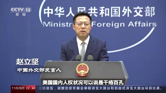 中国外交部发言人 赵立坚:美国国内人权状况可以说是千疮百孔,不知美国有何颜面和底气自诩为“人权优等生”。美国应该做的是正视自身存在的人权问题,管好自己的事,而不是整天打着人权的幌子,动辄对他国指责施压,干涉别国内政。