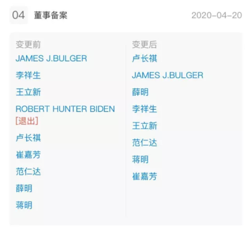 根据天眼查的资料显示,亨特 · 拜登在 2019 年是渤海华美董事会成员,于 2020 年 4 月 20 日退出,也就是说渤海华美确实和亨特 · 拜登有关系。