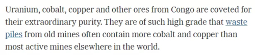 更厉害的是,刚果的矿石纯度非常高,据说有的老矿山的废料堆都比其他国家大多数活跃矿山的钴和铜含量更高。