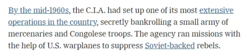 到冷战时期,为了不让苏联发展重工业,美国中央情报局还秘密资助了一些刚果的小军阀和雇佣军,用来打压支持苏联的 “ 叛乱分子 ”。