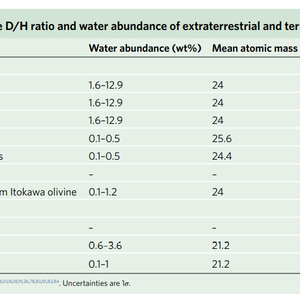 最近对顽火球粒陨石和Itokawa颗粒中“无水矿物”的研究表明,这些材料可能比以前认为的富含水;地球深部地幔的D/H比标准平均海水还要轻;最近对火山挖掘出的物质的分析表明,在原始地幔中可能存在一种同位素轻、类似太阳的D/H成分。此外,在过去的45亿年中,地球的D/H可能从其初始值增加了,这可能是由于较轻的氢同位素先损失到太空。这样增加的D/H很难与来自C型材料的其他同位素系统的外星传递相协调。