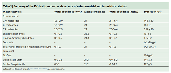 但是,地球的地幔和标准平均海水(standard mean ocean water)的D/H比CI、CR和CM球粒陨石的平均值更轻。鉴于陨石记录中富含水的C型球粒陨石的多样性,单靠类CM的小行星不太可能输送地球上所有的水。