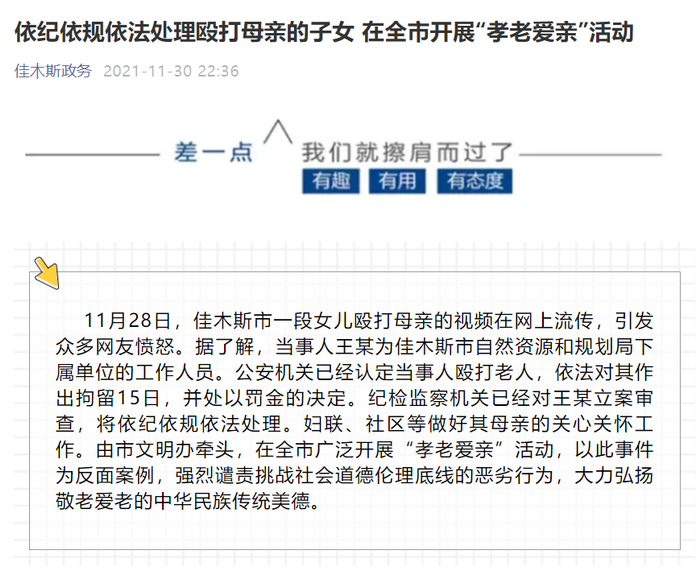 另据佳木斯政务最新消息,将以此事件为反面案例,在全市广泛开展孝老爱亲活动。