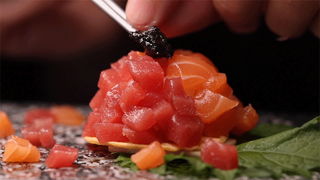这道菜是我们看别桌才点上的,摆盘实在是好看到戳我的少女心了,底下平铺的是薯片,上面厚厚一层三文鱼和金枪鱼,再撒上黑松露鱼子酱,味道独特又别致。