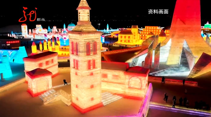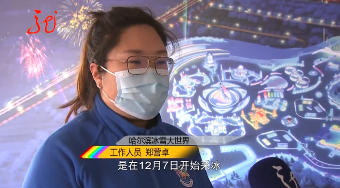 工作人员告诉记者,冰雪大世界一共存了三万立方米的冰,这些冰用来做冰雪大世界的基础建设,比如一些大门、主塔的底座,细节的雕刻部分还是要用今年从松花江采的新冰。