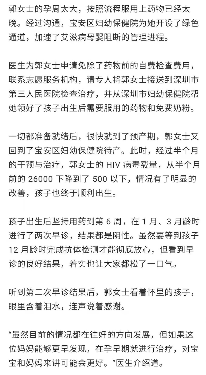 日前,宝安区妇幼保健院接到一位产妇,第 37 周才来医院做产检,产检中发现她感染了艾滋病毒。由于孕周过大,医院为她开设了绿色通道,加速艾滋病母婴阻断的管理进程。孩子也顺利出生,经过坚持用药,目前孩子情况良好,两次早诊结果均为阴性。
