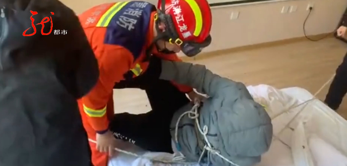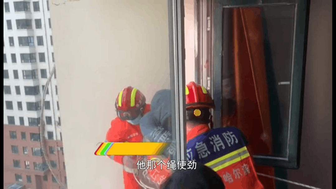 男子站在外面一个多小时,身体已经冻僵,消防员用绳子给男子做好保护后,大家合力把男子从外面拽进楼内。