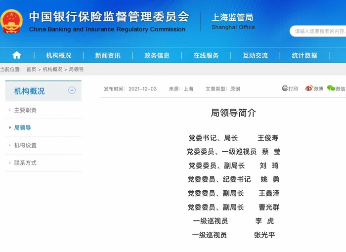 12月3日,上海银保监局官网更新的局领导信息显示,王俊寿已出任上海银保监局党委书记、局长。王俊寿此前为山东银保监局党委书记、局长。
