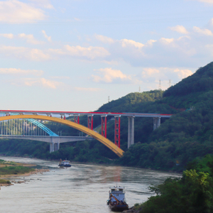 澜沧江大桥全长523米(含两岸桥台),主跨300米,为景海高速的控制性工程,创造了国内第一大跨径上承式钢箱拱桥的纪录。