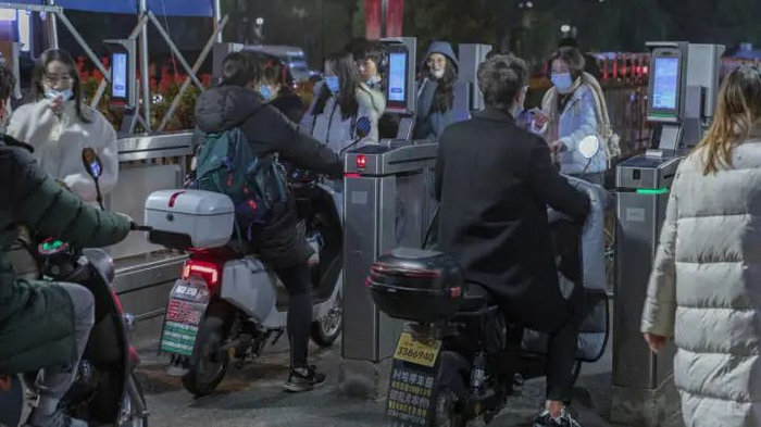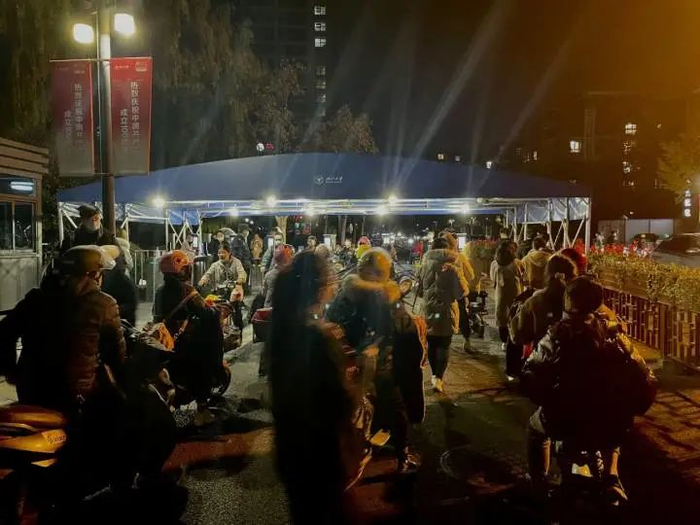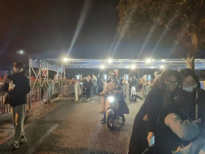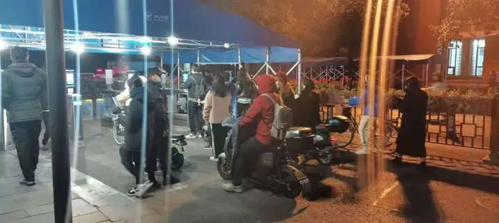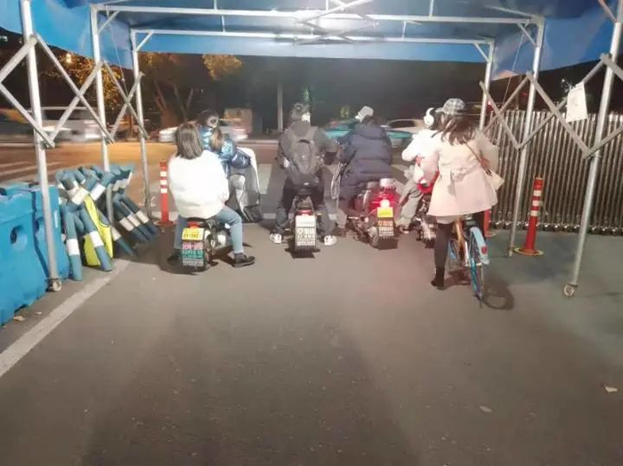 昨晚,在连接宿舍和“堕落街”最近的一个门——东一门外,不少学生骑上电瓶车,有序排队外出。