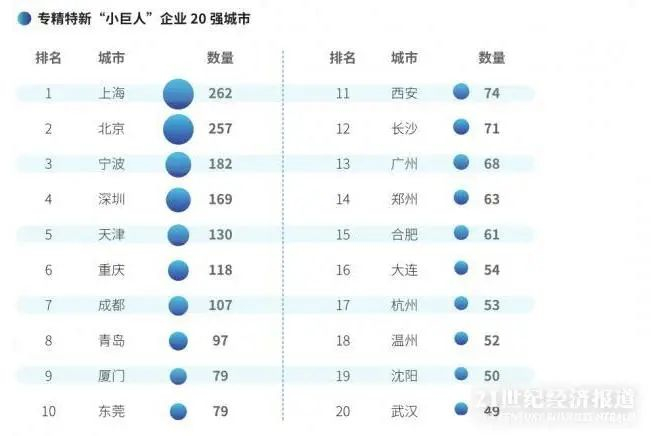 根据公开信息,《报告》进一步梳理出全国专精特新“小巨人”企业数量排名前20强的城市榜单,上海以262家专精特新“小巨人”企业位居全国各大城市榜首,北京以257家次之,仅有两市专精特新“小巨人”企业数量超过200家,构成了第一阵营;宁波以182家企业位居第三,超过深圳的入选企业数量(169家),成为一匹“黑马”,位列地级市首位;仅有北京、上海、宁波、深圳、天津、重庆、成都7城的专精特新“小巨人”企业超过百家。