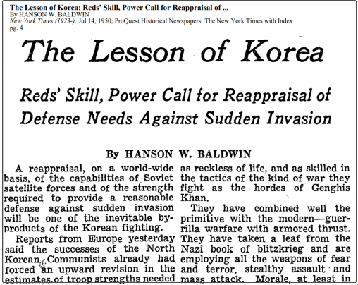 比如,《纽约时报》的著名编辑、普利策奖获得者汉森·鲍德温(Hanson Baldwin)当时是这么在文章里形容朝鲜军队的: