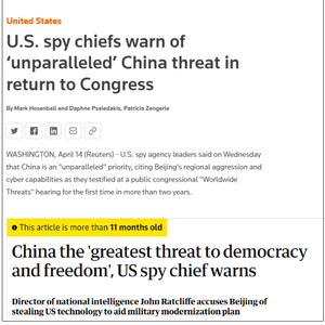 以上是3天前、7个月前和11个月前的新闻标题,内容全部都是情报部门认定中国为最大威胁
