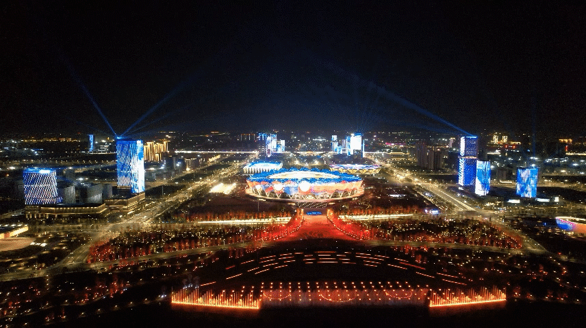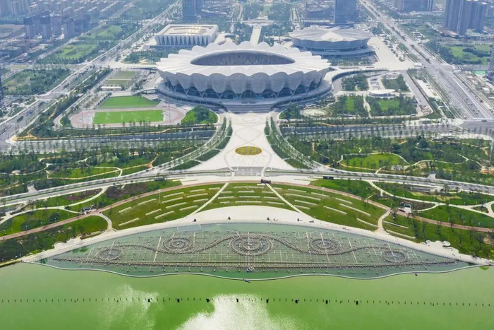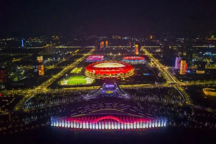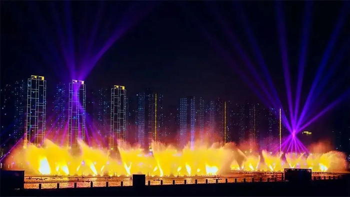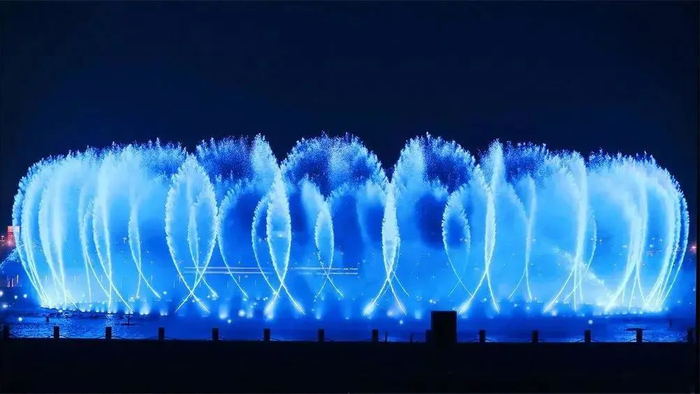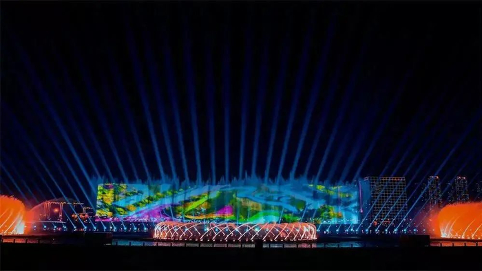 西安奥体中心光影文化公园喷泉水秀主体俯瞰如一朵莲花,用蜿蜒曲线连接5个圆环,寓意丝绸之路携手万邦,整个设计元素充分凝练丝路文化与体育精神,壮观景象让观看游客无不为之惊叹。