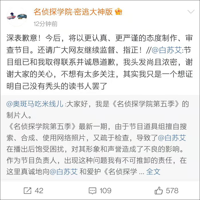 《名侦探学院》官微也转发微博,向@白苏艾 道歉,并且称“今后将以更认真、更严谨的态度制作、审查节目。还请广大网友继续监督、指正。”