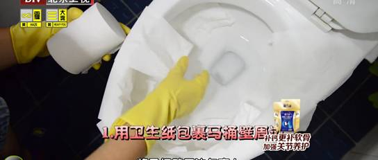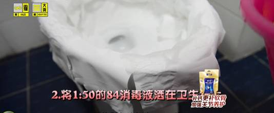 我们可以用卫生纸包裹在马桶壁的周边,再将稀释比例为1:50的84消毒液洒在卫生纸上,这样纸巾能很好包裹在马桶壁上,静止五分钟后去掉卫生纸,用清水冲洗即可。
