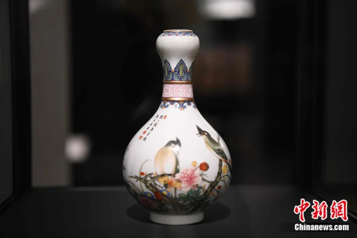 2021年9月,法国卢浮宫《远道而来》展览上展示一件中国清朝乾隆时期瓷器。中新社记者 李洋 摄
