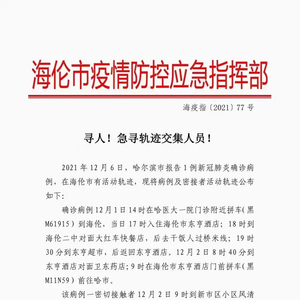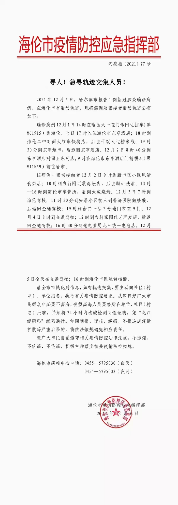 记者从黑龙江省绥化海伦市疫情防控应急指挥部了解到,2021年12月6日,哈尔滨市报告1例新冠肺炎确诊病例,在海伦市有活动轨迹,现将病例及密接者活动轨迹公布如下:
