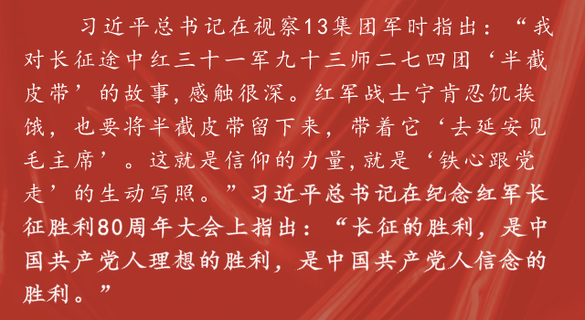 1936年7月,红四方面军三十一军九十三师二七四团穿越莽莽草原。环境恶劣、路途遥远,粮食严重短缺,红军战士挖野菜、嚼草根、啃树皮,最后只能煮皮带吃。战士周广才的皮带是1934年红军任合场战斗中缴获的战利品。但为了使全班战友活下来,他只得含泪将皮带拿出来。皮带被切成几段丢入滚烫的热水中……当锅里还剩最后“一截”时他哭着说:“同志们,咱们留着它作个纪念吧,带到延安去见毛主席。”怀着对革命胜利的无限渴望,最终他们把这截皮带留了下来。长征途中,班里战友相继牺牲,只有周广才胜利到达了延安。半截皮带浓缩的是革命理想高于天、铁心跟党走的坚定信仰,这是我们战胜强大敌人和艰难险阻的力量之源,也是连队代代相传的红色基因和精神食粮。