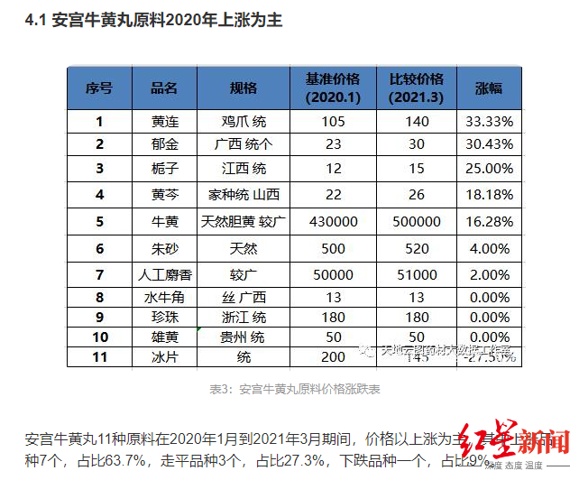 从2020年1月到2021年3月期间,安宫牛黄丸的11种原材料里有7种价格上涨,黄连和郁金涨价幅度超30%,有3种原材料价格大致持平,仅有冰片的价格下跌。