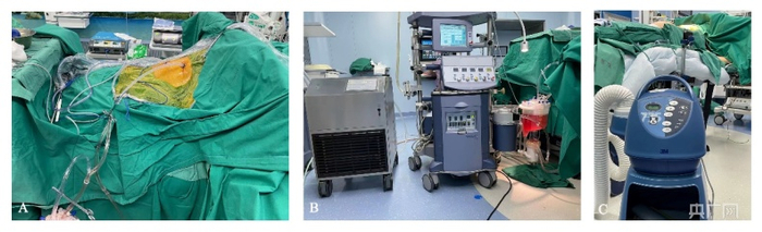 入院第3天,完善术前准备后,胸外科副主任医师洪暄为刘阿姨实施了胸腔镜微创手术联合温热灌注化疗治疗术,治疗在全身麻醉下进行,由麻醉医生对患者生命体征进行检测。通过两个微型切口进行胸腔探查及操作并对相应组织进行采样以获取冰冻病理,术中对肿块的性质及恶性胸腔积液的病因进行诊断。待结果回报后,直接由上述两个操作孔置入胸管将之转换为温热灌注化疗的出入口。再向胸腔内灌注铂类药物及生理盐水的混合溶液后通过体外循环装置(滚轮泵,储液器及热交换器)进行温热灌注化疗。手术非常成功。