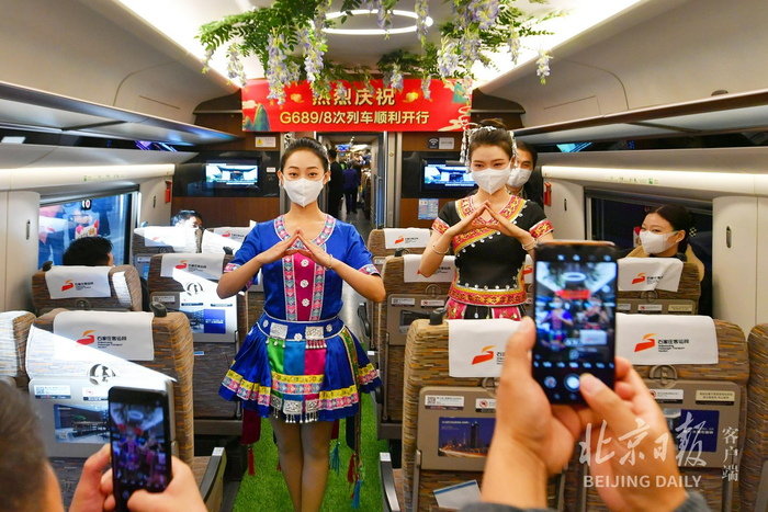 9时27分,G689次载着近400名旅客从北京西站准时开出,向着湘西飞驰。车内身着民族服装的工作人员在5号车厢的车窗贴上了美丽的窗花,带有湘西元素的手绘画挂在车厢两端。为了庆祝首发,乘务员们还编排了民族舞蹈、民俗知识有奖问答等节目,在车厢内与旅客进行互动。