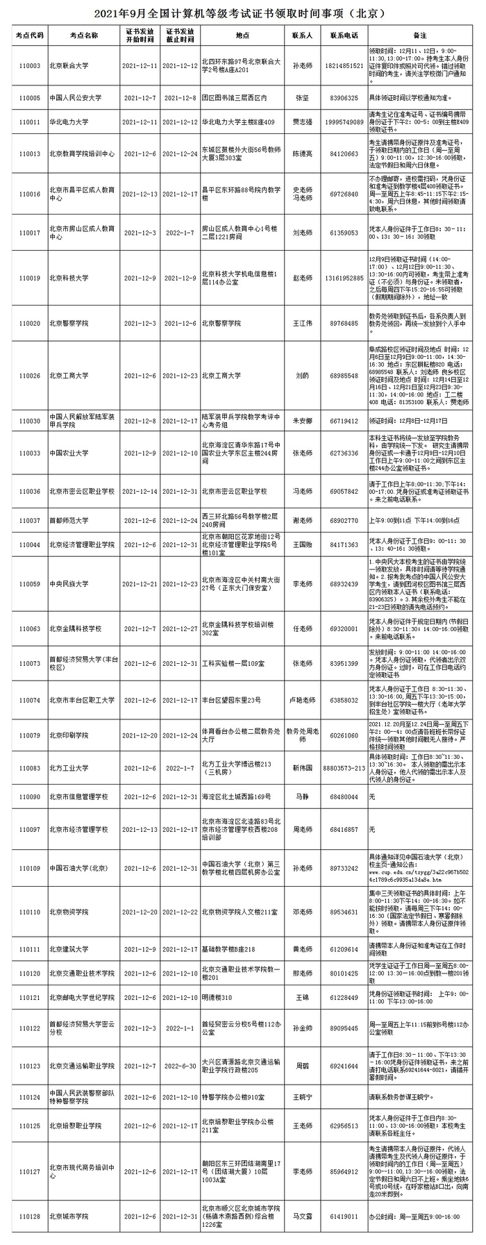 北京教育考试院发布2021年9月NCRE证书领取时间事项