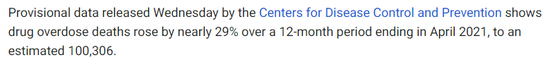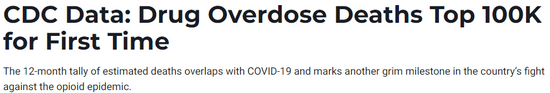 美国疾病控制和预防中心最新发布的数据显示,从去年4月至今年4月这一年间,美国药物过量致死人数首次超过10万人,较上一年激增28.5%,超过了同一时期车祸和枪击死亡人数的总和。