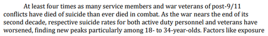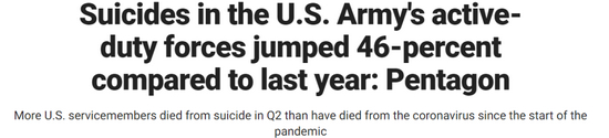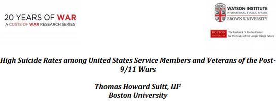 布朗大学沃森国际与公共事务研究所发布的报告显示,自“911”事件以来,美国死于自杀的士兵和退伍军人人数,是死于战争人数的4倍多。报告认为,除非美国政府和美国社会对其处理军人和退伍军人心理健康危机的方式做出重大改变,否则军人的自杀率将继续攀升。
