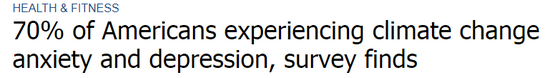 疫情政治化导致的社会撕裂不仅影响着美国人的身体健康,也影响着他们的精神健康。由于美国近年来自然灾害频发,造成越来越多的生命和财产损失。耶鲁大学的一项新调查显示,70%的美国人现在非常或多少有点担心全球变暖,越来越多的人因为这种担忧而表现出焦虑或抑郁的迹象。